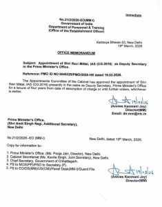 वहीं जारी आदेश के मुताबिक, रवि मित्तल को पीएमओ में डिप्टी सेक्रेटरी के रूप में चार वर्ष के कार्यकाल के लिए नियुक्त किया गया है। उनका कार्यकाल पदभार ग्रहण करने की तिथि से प्रभावी होगा या अगले आदेश तक रहेगा – जो भी पहले हो। यह नियुक्ति सीधे तौर पर केंद्र सरकार के शीर्ष प्रशासनिक ढांचे में मानी आईएएस रवि मित्तल जा रही है। पीएमओ में तैनाती को किसी भी अधिकारी के लिए बेहद महत्वपूर्ण और प्रभावशाली जिम्मेदारी माना जाता है, जहां नीतिगत फैसलों और समन्वय की अहम भूमिका होती है। कार्मिक एवं प्रशिक्षण विभाग द्वारा आईएएस रवि मित्तल जारी ऑफिस मेमोरेंडम में स्पष्ट किया गया है कि कैबिनेट की नियुक्ति समिति (ACC) ने इस नियुक्ति को मंजूरी दी है। आदेश में संबंधित विभागों और अधिकारियों को इसकी जानकारी भी भेज दी गई है।
