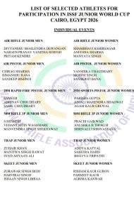 राष्ट्रीय राइफल संघ भारत (NRAI) द्वारा जारी चयन सूची के अनुसार, श्री दिव्यांशु शैलेंद्र देवांगन का चयन 10 मीटर एयर राइफल (जूनियर पुरुष) स्पर्धा में भारत का प्रतिनिधित्व करने के लिए किया गया है। यह चयन उनके निरंतर उत्कृष्ट प्रदर्शन, अनुशासन तथा राष्ट्रीय स्तर की प्रतियोगिताओं में प्राप्त उपलब्धियों का प्रतिफल है।