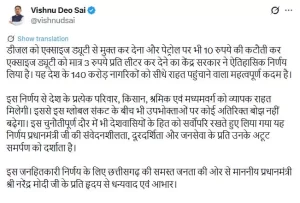 रायपुर। मुख्यमंत्री विष्णु देव साय ने डीजल-पेट्रोल को लेकर मोदी सरकार के लिए फैसले का स्वागत किया। सीएम ने X पोस्ट में लिखा, डीजल को एक्साइज ड्यूटी से मुक्त कर देना और पेट्रोल पर भी 10 रुपये की कटौती कर एक्साइज ड्यूटी को मात्र 3 रुपये प्रति लीटर कर देने का केंद्र सरकार ने ऐतिहासिक निर्णय लिया है। यह देश के 140 करोड़ नागरिकों को सीधे राहत पहुंचाने वाला महत्वपूर्ण कदम है। आपको बता दें की इस निर्णय से देश के प्रत्येक परिवार, किसान, श्रमिक एवं मध्यमवर्ग को व्यापक राहत मिलेगी। इससे इस ग्लोबल संकट के बीच भी उपभोक्ताओं पर कोई अतिरिक्त बोझ नहीं बढ़ेगा। इस चुनौतीपूर्ण दौर में भी देशवासियों के हित को सर्वोपरि रखते हुए लिया गया यह निर्णय प्रधानमंत्री जी की संवेदनशीलता, दूरदर्शिता और जनसेवा के प्रति उनके अटूट समर्पण को दर्शाता है। इस जनहितकारी निर्णय के लिए छत्तीसगढ़ की समस्त जनता की ओर से माननीय प्रधानमंत्री श्री नरेंद्र मोदी जी के प्रति हृदय से धन्यवाद एवं आभार।