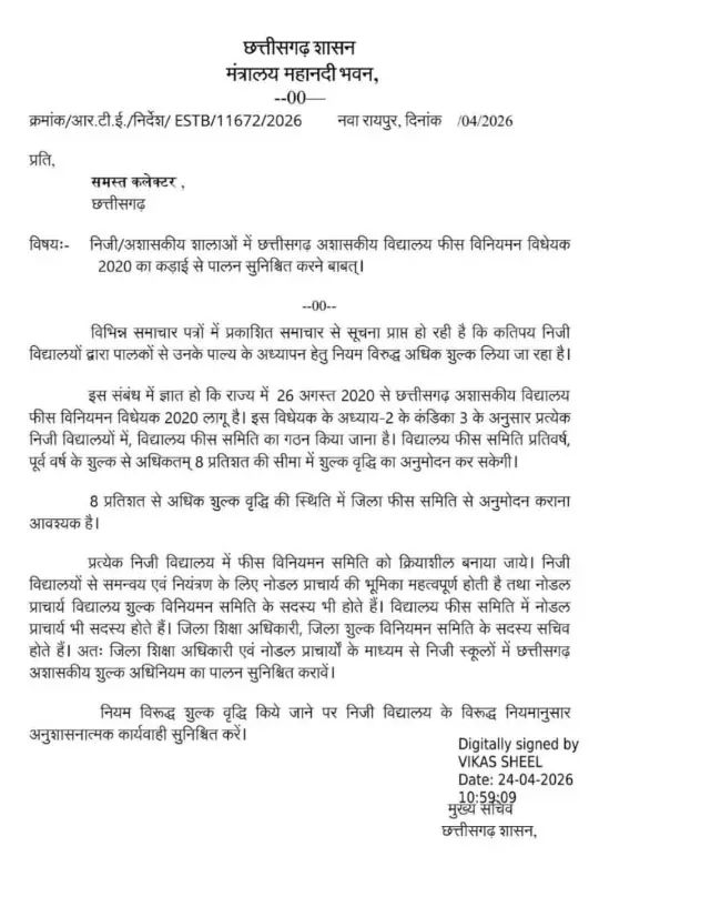 रायपुर। मुख्य सचिव विकासशील ने छत्तीसगढ़ स्कूल शिक्षा विभाग और माशिमं से मान्यता प्राप्त निजी स्कूलों की मनमानी फीस वृद्धि पर नकेल कसने कलेक्टरों को अधिकृत किया है। शील ने कलेक्टरों से कहा है कि निजी/अशासकीय शालाओं में छत्तीसगढ़ अशासकीय विद्यालय फीस विनियमन विधेयक 2020 का कड़ाई से पालन कराया जाए। उन्होंने कहा है कि कतिपय निजी विद्यालयों द्वारा पालकों से उनके बच्चों के अध्यापन हेतु नियम विरुद्ध अधिक शुल्क लिया जा रहा है। इस संबंध में ज्ञात हो कि राज्य में 26 अगस्त 2020 से छत्तीसगढ़ अशासकीय विद्यालय फीस विनियमन विधेयक 2020 लागू है। इस विधेयक के अनुसार प्रत्येक निजी विद्यालयों में, विद्यालय फीस समिति का गठन किया जाना है। विद्यालय फीस समिति प्रतिवर्ष, पूर्व वर्ष के शुल्क से अधिकतम् 8 प्रतिशत की सीमा में शुल्क वृद्धि का अनुमोदन कर सकेगी।
