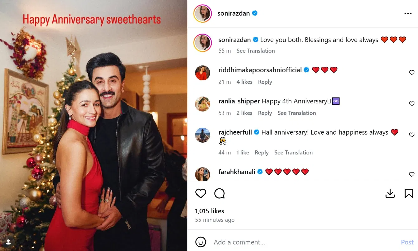 रणबीर-आलिया की वेडिंग एनिवर्सरी: नीतू कपूर और सोनी राजदान ने सोशल मीडिया पर लुटाया प्यार।