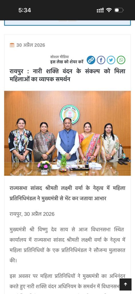 नारी शक्ति वंदन के संकल्प को मिला महिलाओं का व्यापक समर्थन, राज्यसभा सांसद लक्ष्मी वर्मा के नेतृत्व में महिला प्रतिनिधिमंडल ने सीएम से भेंट कर जताया आभार