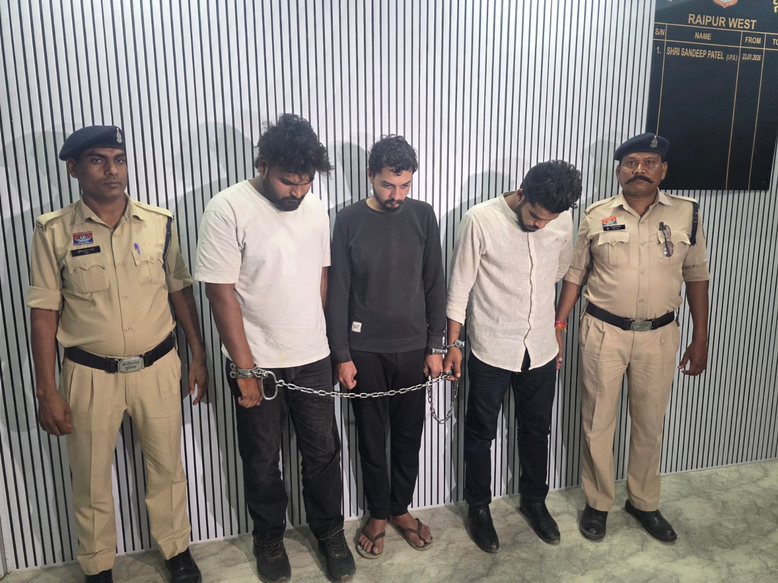 रायपुर। राजधानी रायपुर में दिनांक 29.04.2026 को थाना न्यू राजेन्द्र नगर पुलिस को सूचना प्राप्त हुई कि, अमलीडीह स्थित स्टार वैली स्कूल के आगे रोड पर काले रंग की थार वाहन क्रमांक CG 04 QE 9904 में तीन व्यक्ति मादक पदार्थ रखकर बिक्री करने की फिराक में हैं। सूचना को गंभीरता से लेते हुए पुलिस उपायुक्त (पश्चिम क्षेत्र) संदीप पटेल के मार्गदर्शन में एडीसीपी राहुल देव शर्मा, एसीपी आजाद चौक इशू अग्रवाल एवं एसीपी न्यू राजेन्द्र नगर नवनीत पाटिल के पर्यवेक्षण में थाना प्रभारी को आवश्यक दिशा-निर्देश दिए गए। थाना प्रभारी न्यू राजेन्द्र नगर के नेतृत्व में पुलिस टीम द्वारा मौके पर पहुंचकर मुखबिर द्वारा बताए गए वाहन को घेराबंदी कर पकड़ा गया।